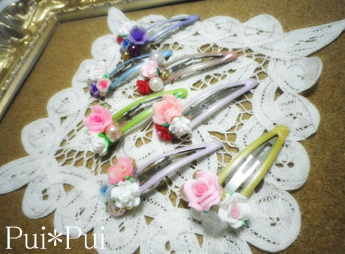 バラパーツやフェイクパールを、パッチンピンに盛りました。