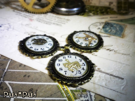 手持ちの古い懐中時計の文字盤を加工し背景にユニコーンや木馬、ツバメと一緒に閉じ込めました。バイキングが羅針盤代わりにしていた…という逸話もあるアイオライトと一緒にペンダントにする予定です。参加中